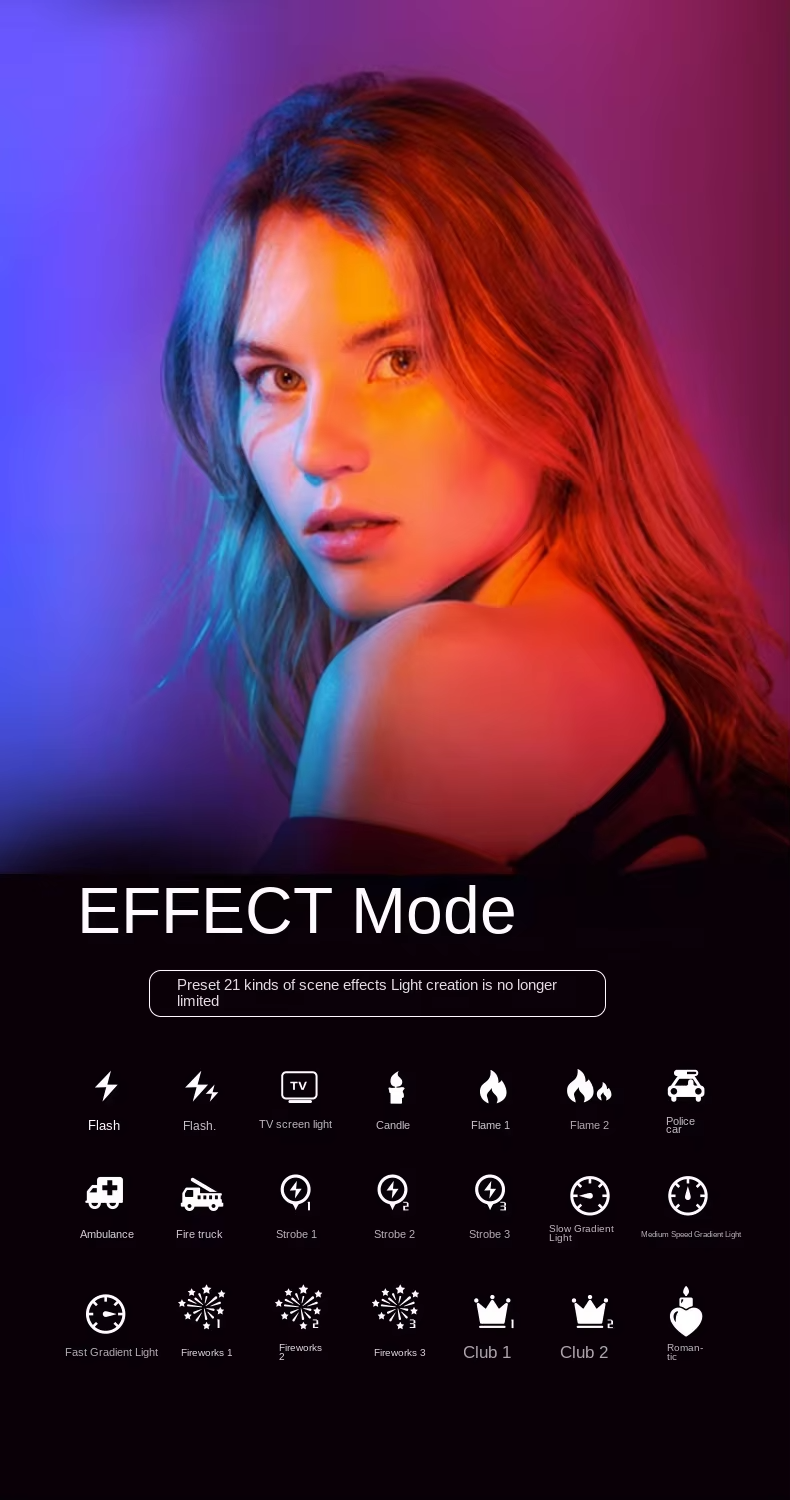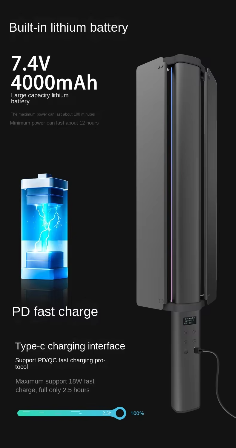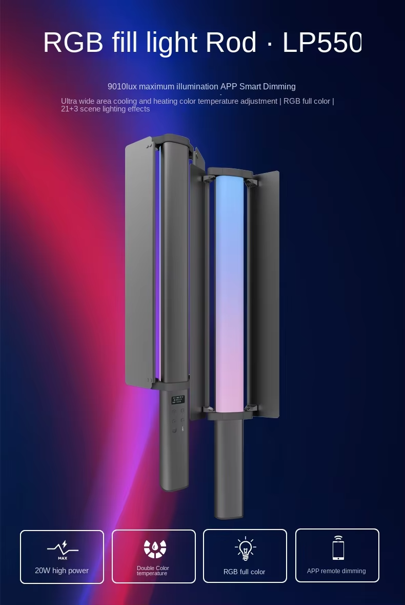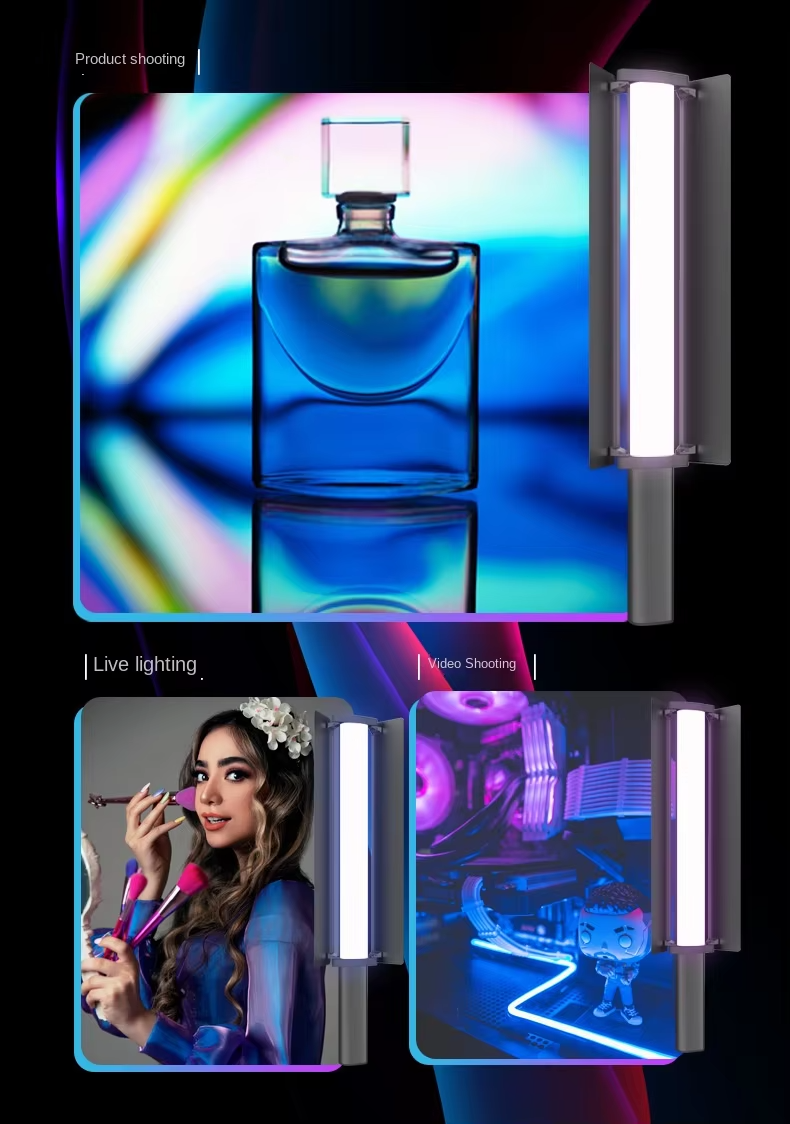 Application scenario Photography: When taking photos or videos, it can be used as a fill light to provide additional light for people or objects, improve the situation of insufficient light, and also create different atmospheres and effects by adjusting color and brightness, enhancing the sense of layer and art of the picture. Live streaming and short video creation: Suitable for live streaming, short video shooting and other scenes, to help creators create personalized lighting effects, attract the attention of the audience, improve the quality and enjoyment of the work. Outdoor adventure and camping: In outdoor adventure, camping and other activities, can be used as a lighting tool to provide the necessary light, its portability and a variety of light effect modes can also add fun to outdoor activities, such as simulated campfire effect. Stage performance and event layout: can be used for stage performances, parties, weddings and other activities of the scene layout, through the adjustment of lighting color and effect, to create a cheerful, romantic, mysterious and other different atmosphere, to add luster to the activity. Creative design and artistic creation: Artists and designers can use the rich colors and light effects of hand-held RGB stick lights to carry out creative design and artistic creation, such as light painting, installation art, etc., to show unique artistic effects.